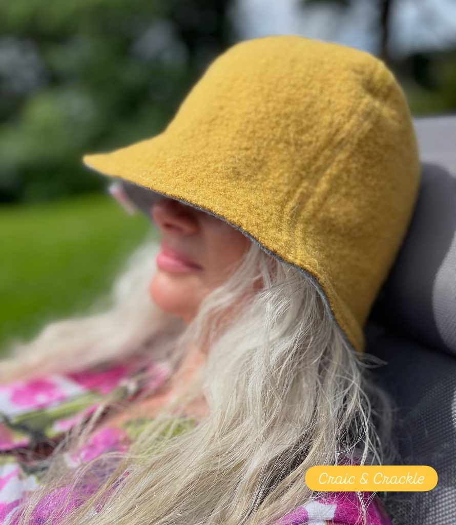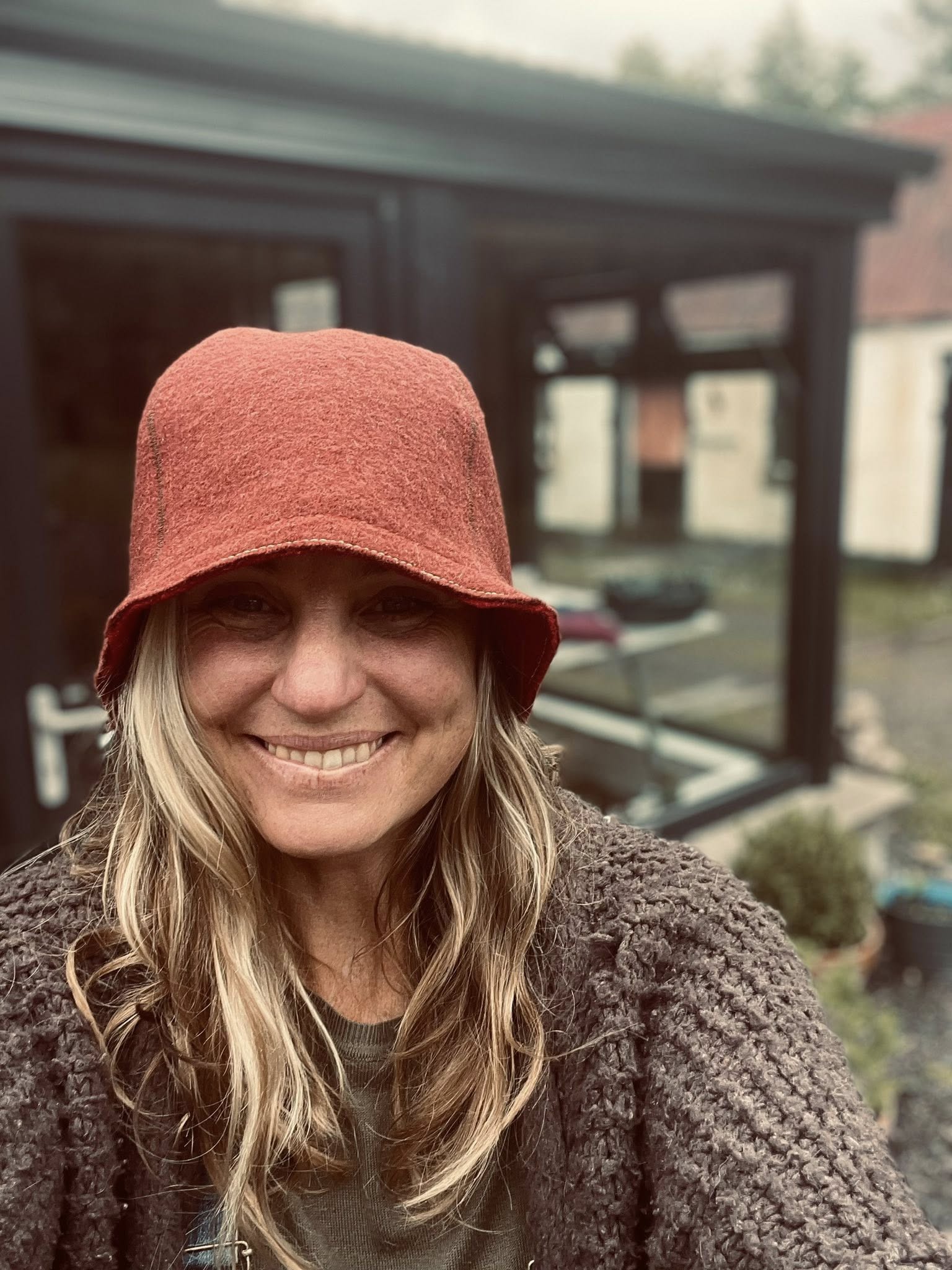 Georgette’s path to sauna hats runs through a much longer relationship with craft. She learned to sew in school, in a textiles class taught by a teacher she describes as quite frightening and good for it. She wanted to do textiles for A levels but the course was dropped. Life moved on. She studied spatial design in Manchester, had three children, and eventually bought a sewing machine that sat on her kitchen table for months before she found the courage to switch it on.